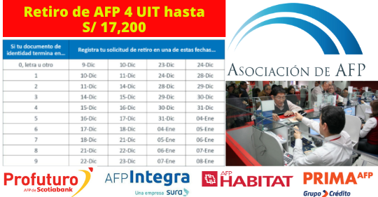 Retiro de fondos de AFP hasta S/ 17,200(4 UIT) aprobado por el congreso de la República y publicado en el diaria EL PERUANO los beneficiarios podrán realizar su solicitud a partir del 9 de diciembre