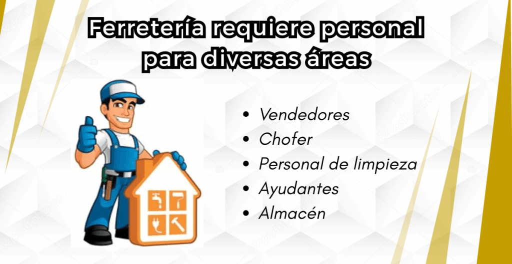 Ferretería requiere personal para diversas áreas, tienda de almacenes de materiales de construcción requiere personal para cubrir algunas vacantes disponibles, en algunas requiere experiencia y en otras areas no es necesario.