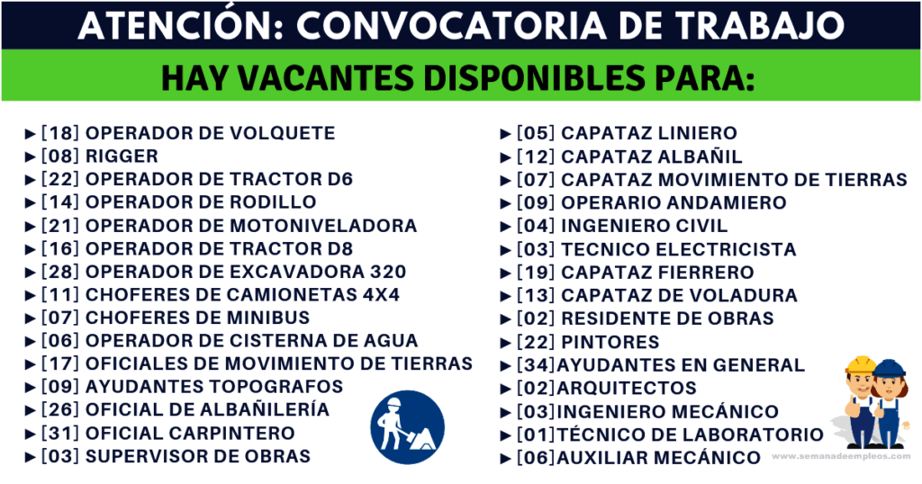 Actualmente la compañia ofrece muchas oportunidades de empleo, en diferentes puestos de trabajo que va dirigido a técnicos, profesionales y practicantes, operadores de maquinarias pasadas, si estas interesado puedes aplicar a las siguientes vacantes.