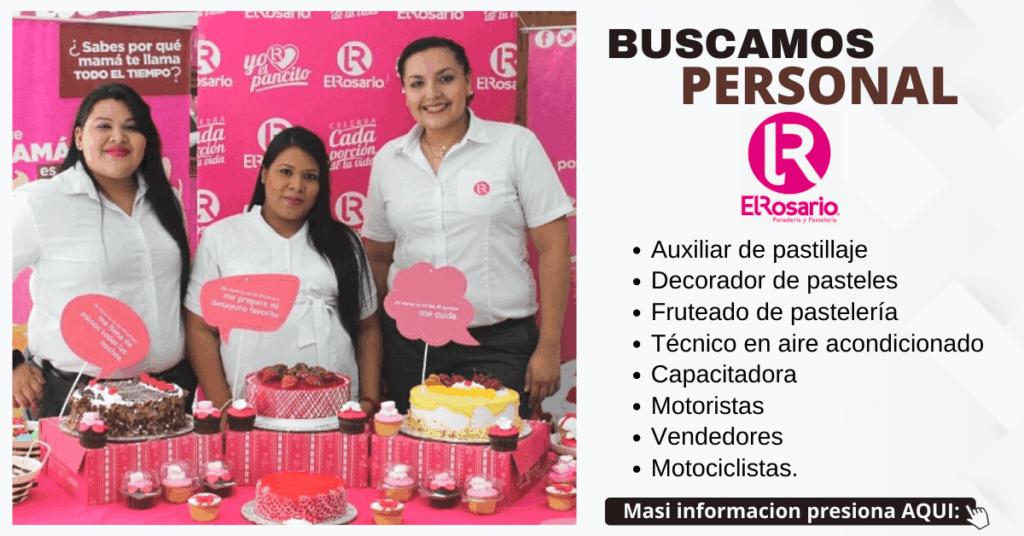 Panadería y pastelería El Rosario más busca personal, la calidad y la innovación son los pilares fundamentales para el crecimiento de la pastelería cuya historia empezó desde el empuje y la visión empresarial para conquistar y ofrecer un servicio de sabor único en todo el país.