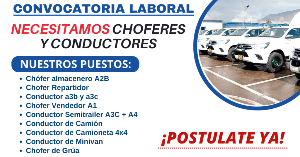 Reconocidas empresas abren sus puertas a nuevos talentos para brindarles una oportunidad de formar parte de su equipo, ocupando el puesto de conductor o chofer con una mínima experiencia en el sector, si te encuentras con disponibilidad y desear unirte lo mas pronto, revisa toda la información de abajo.