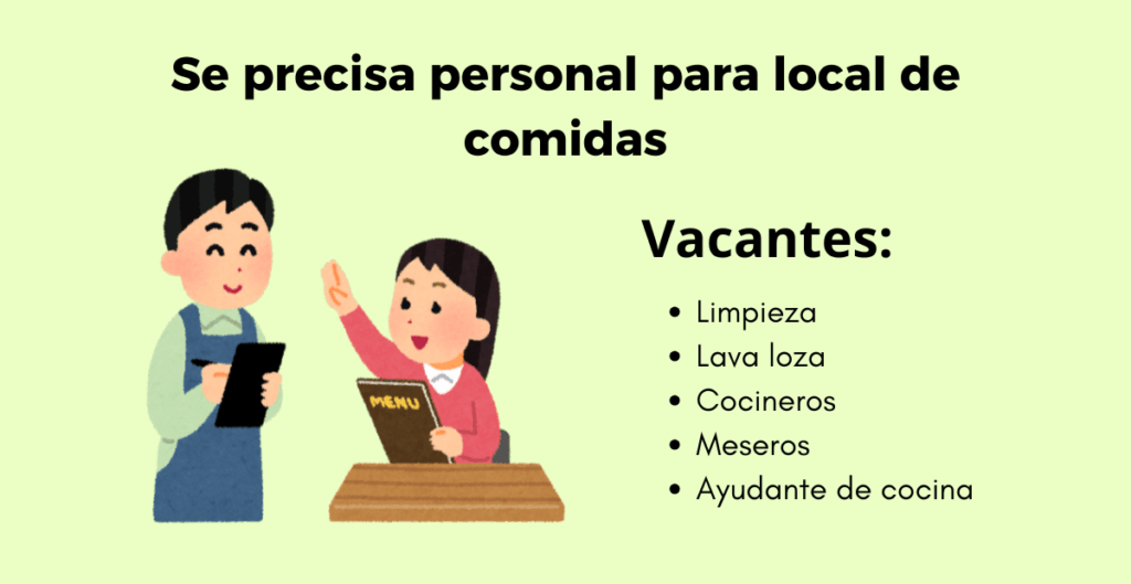 Se precisa personal para local de comidas, diferentes restaurantes buscan personal para trabajar en diferentes áreas, con las responsabilidades de brindar el mejor servicio de calidad a los comensales.